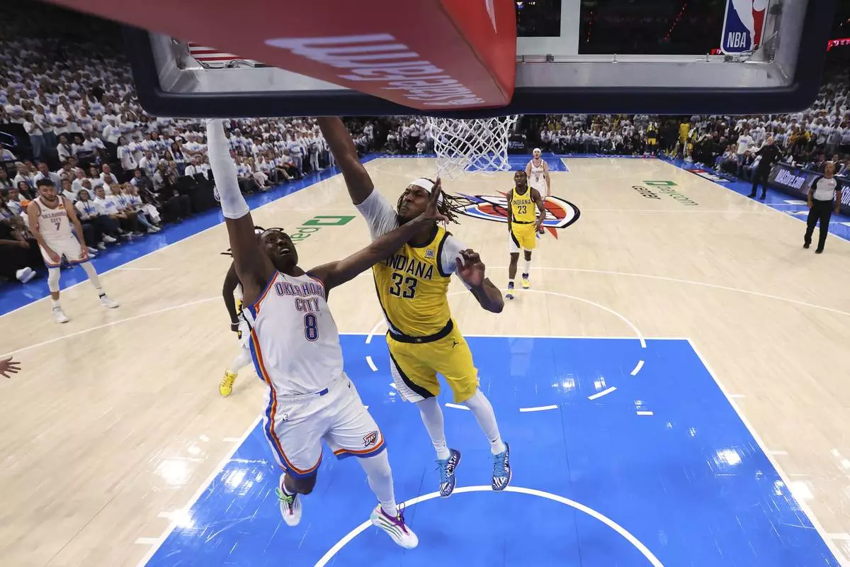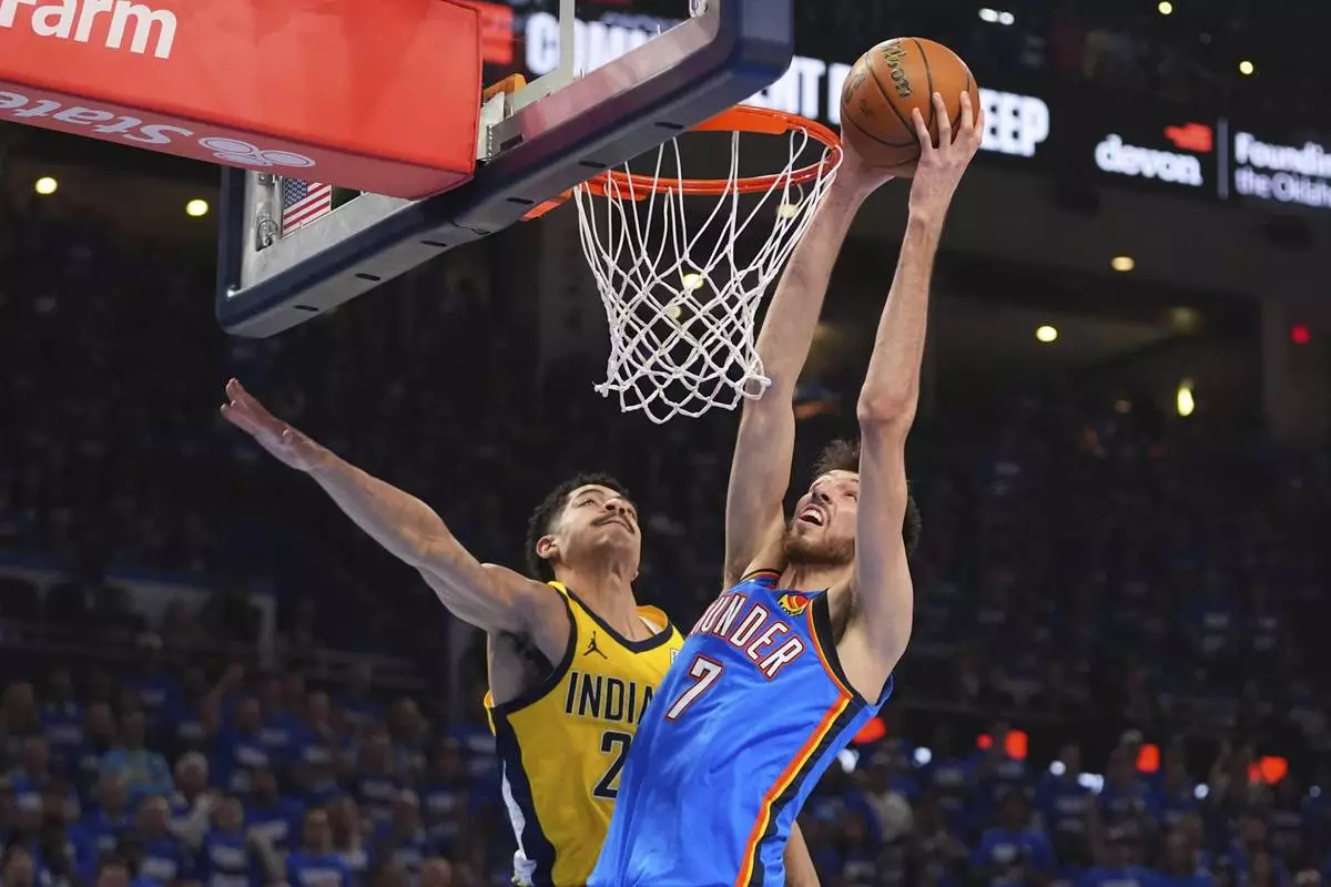 Oklahoma City Thunder forward Chet Holmgren (7) dunks against Indiana Pacers guard Ben Sheppard (26) during the first half of Game 2 of the NBA Finals basketball series Sunday, June 8, 2025, in Oklahoma City. (AP Photo/Julio Cortez)