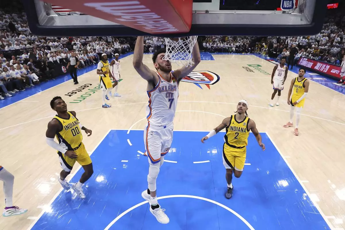 Oklahoma City Thunder forward Chet Holmgren (7) dunks during the second half in Game 1 of the NBA Finals basketball series against the Indiana Pacers Thursday, June 5, 2025, in Oklahoma City. (Matthew Stockman/Pool Photo via AP)