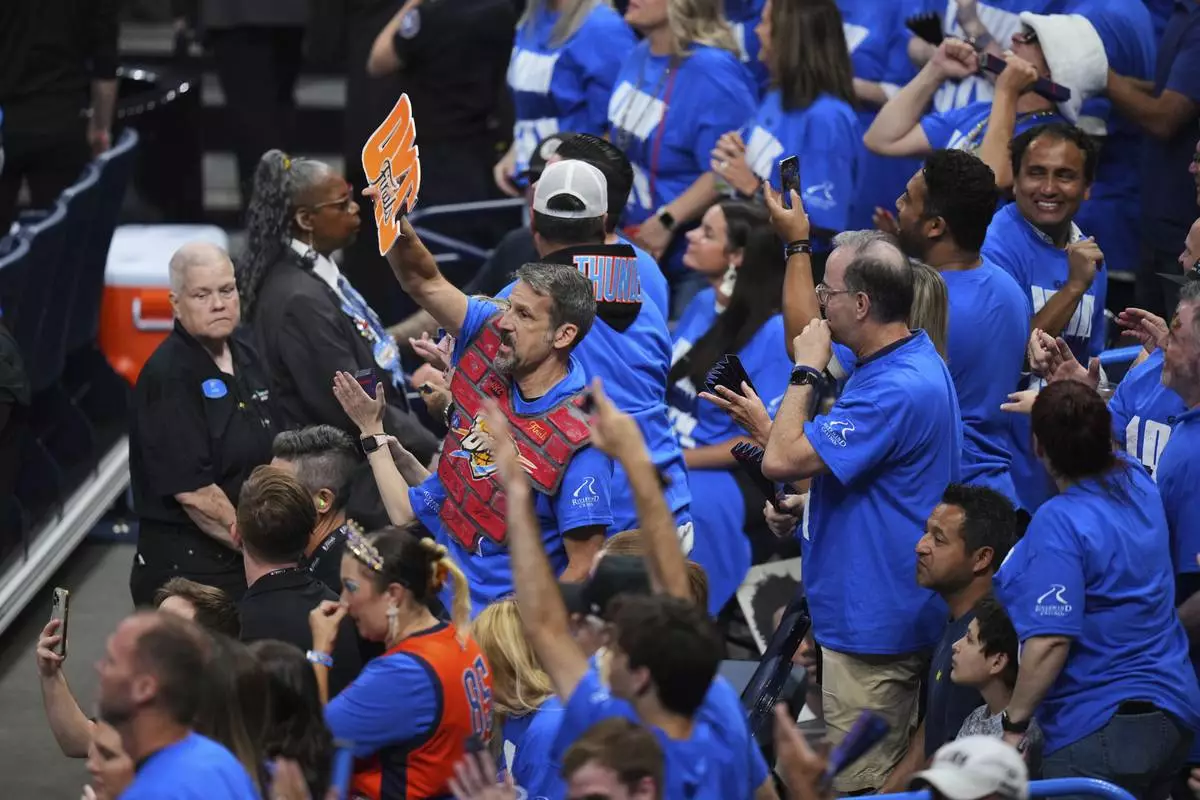 Oklahoma City Thunder fans cheer during the first half of Game 2 of the NBA Finals basketball series against the Indiana Pacers Sunday, June 8, 2025, in Oklahoma City. (AP Photo/Kyle Phillips)