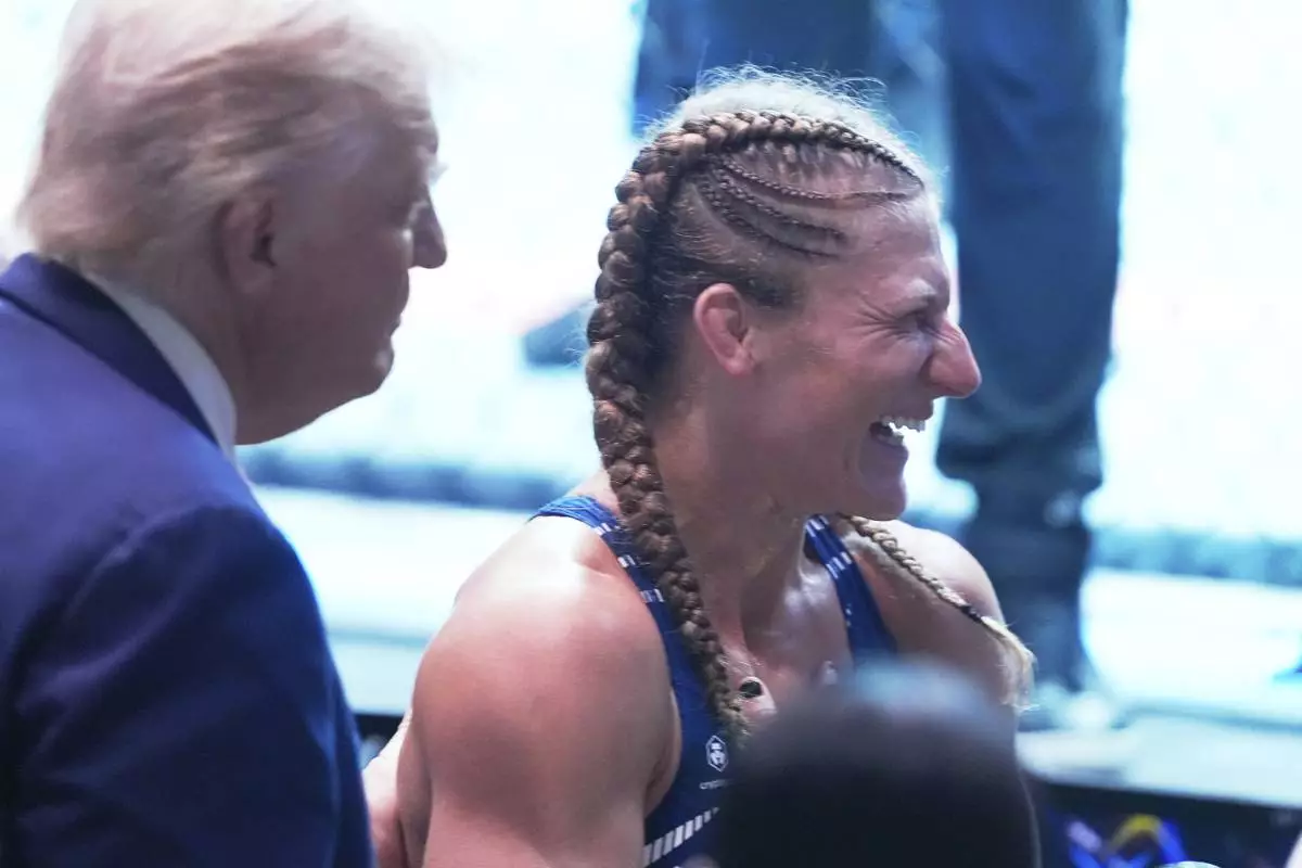 She hopped down from the cage and draped her belt over Trump’s shoulder as he stood from his cageside seat. They hugged and she posed for photos with the president and his entourage.