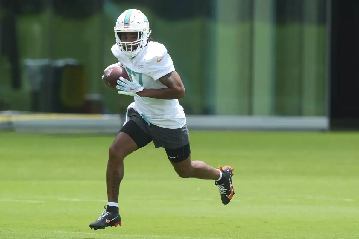 Miami Dolphins wide receiver Jaylen Waddle (17) runs drills during an NFL football practice, Wednesday, May 28, 2025, in Miami Gardens, Fla. (AP Photo/Marta Lavandier)