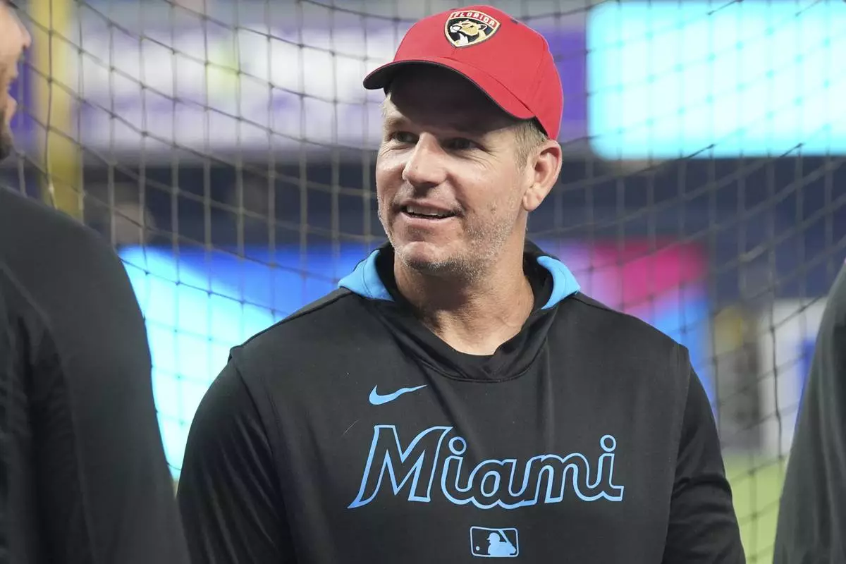 Miami Marlins manager Clayton McCullough wears a Florida Panthers cap before a baseball game against the San Francisco Giants, Friday, May 30, 2025, in Miami. (AP Photo/Lynne Sladky)