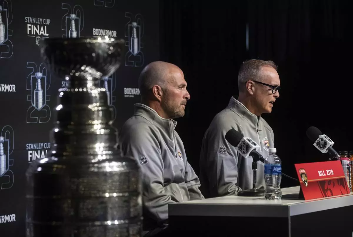 Florida Panthers' general manager Bill Zito, left, and head coach Paul Maurice speak to media during a news conference, Tuesday, June 3, 2025, in Edmonton, Alberta, ahead of Game 1 of the NHL hockey Stanley Cup final series against the Edmonton Oilers. (Jason Franson/The Canadian Press via AP)