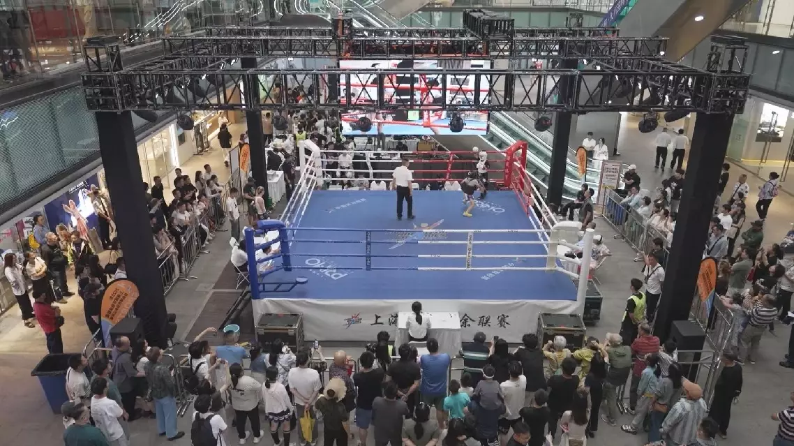 In a shopping mall located in Xuhui District, an amateur kickboxing competition was enthusiastically organized. Featuring a standard boxing ring, stunning lighting effects, and high-definition four-sided screens, drawing many spectators.