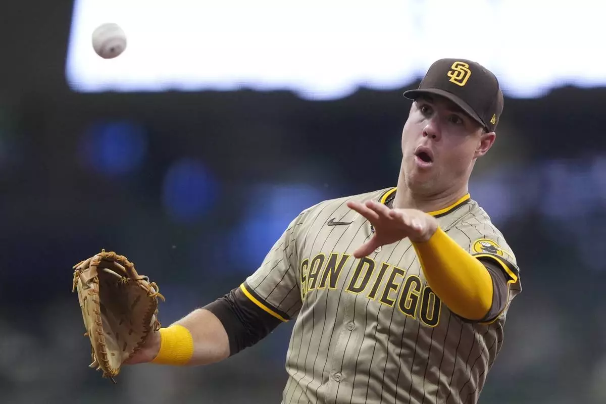 San Diego Padres' Gavin Sheets throws to first base during the sixth inning of a baseball game against the Milwaukee Brewers, Sunday, June 8, 2025, in Milwaukee. (AP Photo/Aaron Gash)