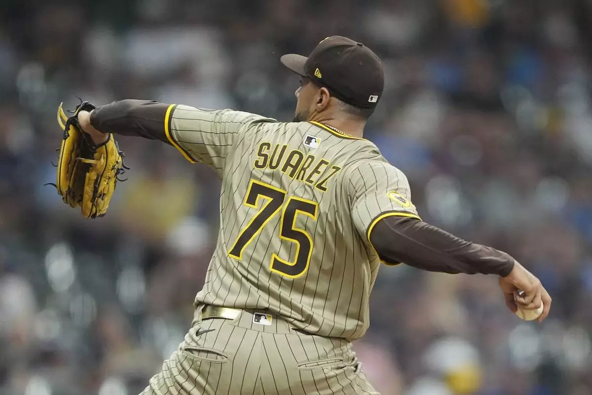 San Diego Padres' Robert Suarez pitches during the ninth inning of a baseball game against the Milwaukee Brewers, Sunday, June 8, 2025, in Milwaukee. (AP Photo/Aaron Gash)