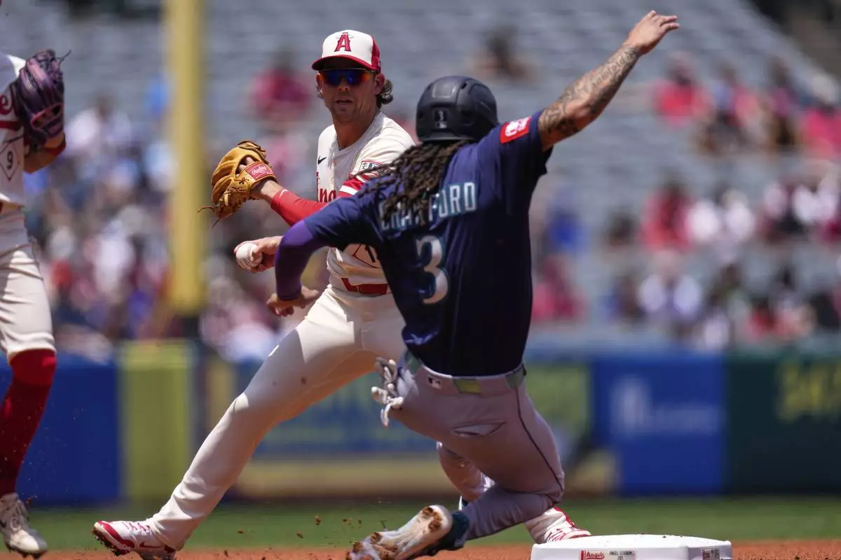 Seattle Mariners' J.P. Crawford, right, is forced out at second while Los Angeles Angels second baseman Scott Kingery us unable to throw out Julio Rodriguez at first during the first inning of a baseball game Sunday, June 8, 2025, in Anaheim, Calif. (AP Photo/Mark J. Terrill)