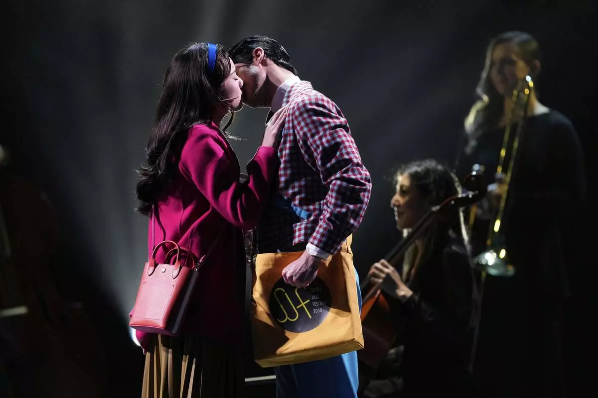 Helen J Shen, left, and Darren Criss perform "Never Fly Away" from "Maybe Happy Ending" during the 78th Tony Awards on Sunday, June 8, 2025, at Radio City Music Hall in New York. (Photo by Charles Sykes/Invision/AP)