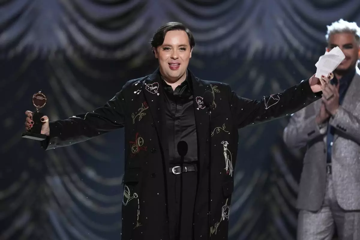 Sam Pinkleton accepts the award for best direction of a play for "Oh, Mary!" during the 78th Tony Awards on Sunday, June 8, 2025, at Radio City Music Hall in New York. (Photo by Charles Sykes/Invision/AP)