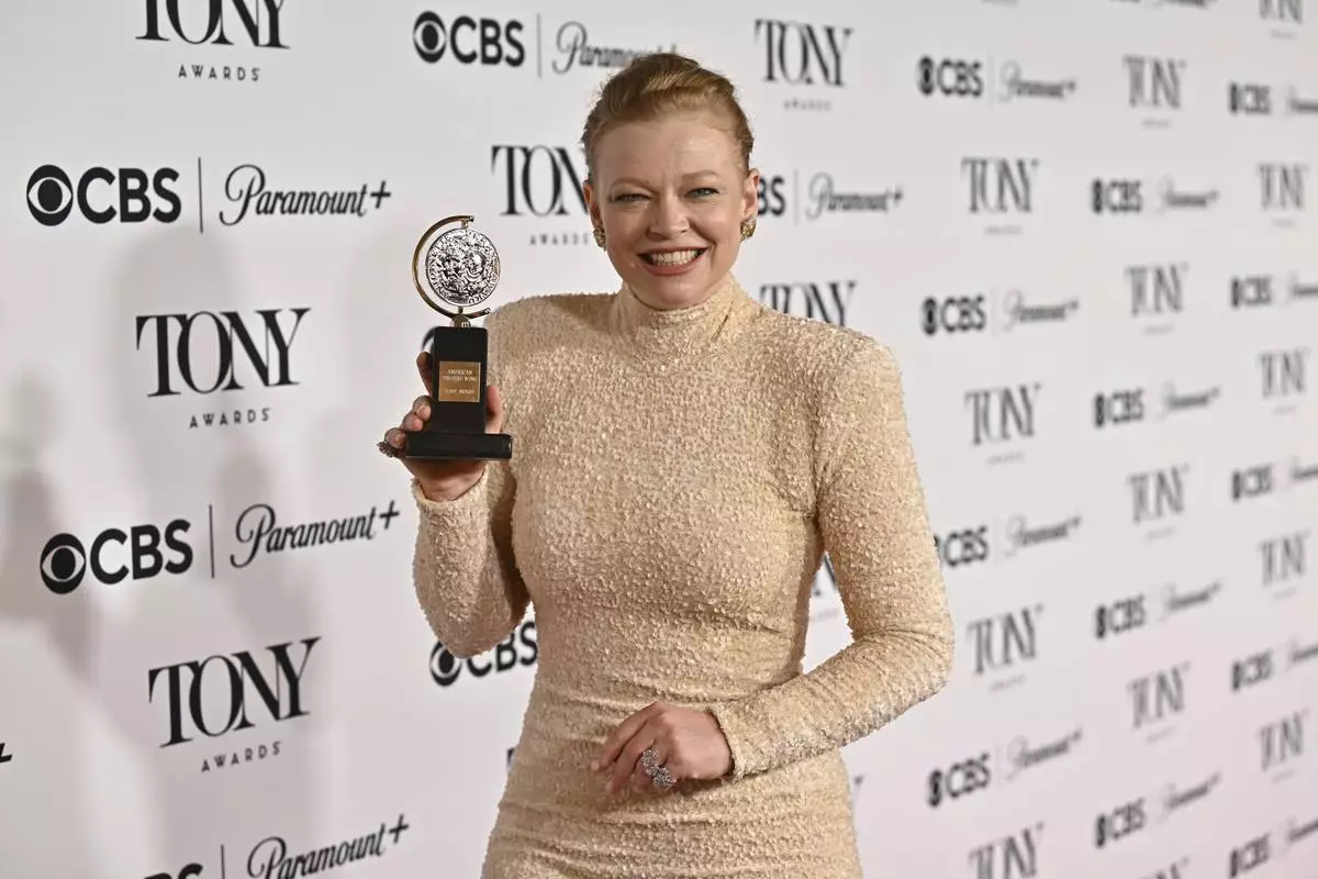 Sarah Snook poses in the press room with the award for best performance by an actress in a leading role in a play for "The Picture of Dorian Gray" during the 78th Tony Awards on Sunday, June 8, 2025, at Radio City Music Hall in New York. (Photo by Evan Agostini/Invision/AP)