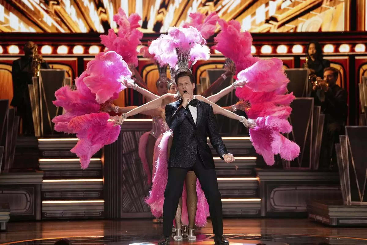 Jonathan Groff, center, performs a medley from "Just in Time" during the 78th Tony Awards on Sunday, June 8, 2025, at Radio City Music Hall in New York. (Photo by Charles Sykes/Invision/AP)