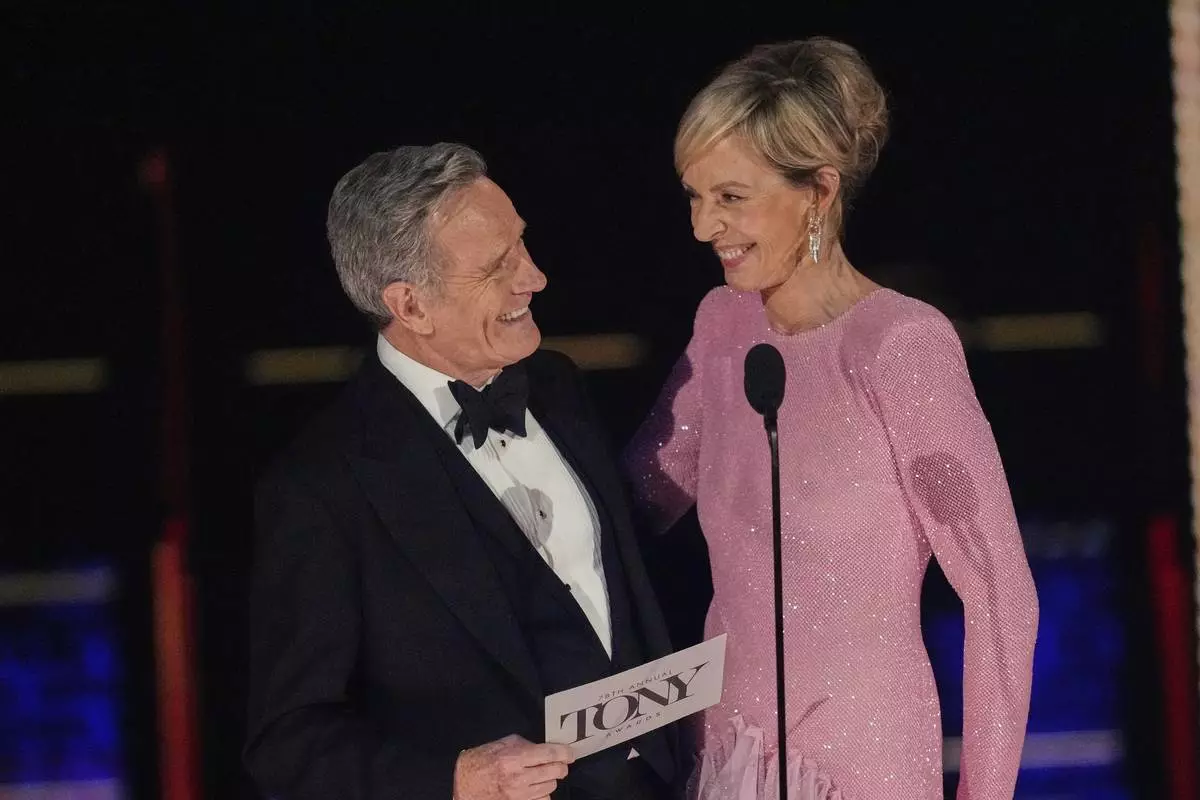 Bryan Cranston, left, and Allison Janney present the award for best direction of a play during the 78th Tony Awards on Sunday, June 8, 2025, at Radio City Music Hall in New York. (Photo by Charles Sykes/Invision/AP)