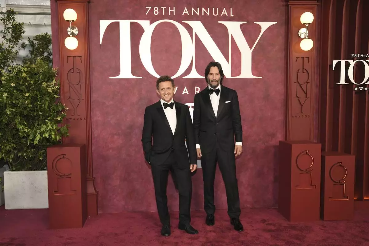 Alex Winter, left, and Keanu Reeves arrive at the 78th Tony Awards on Sunday, June 8, 2025, at Radio City Music Hall in New York. (Photo by Evan Agostini/Invision/AP)