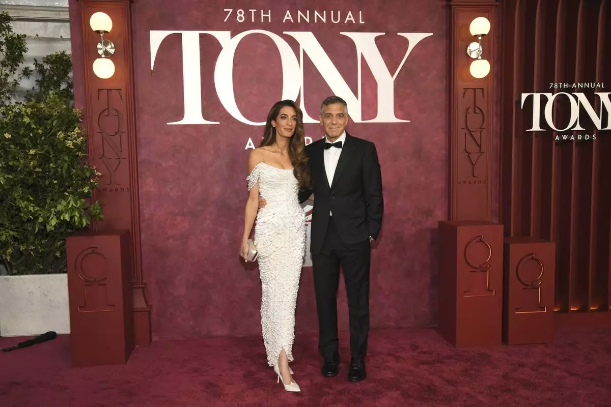 Amal Clooney, left, and George Clooney arrive at the 78th Tony Awards on Sunday, June 8, 2025, at Radio City Music Hall in New York. (Photo by Evan Agostini/Invision/AP)