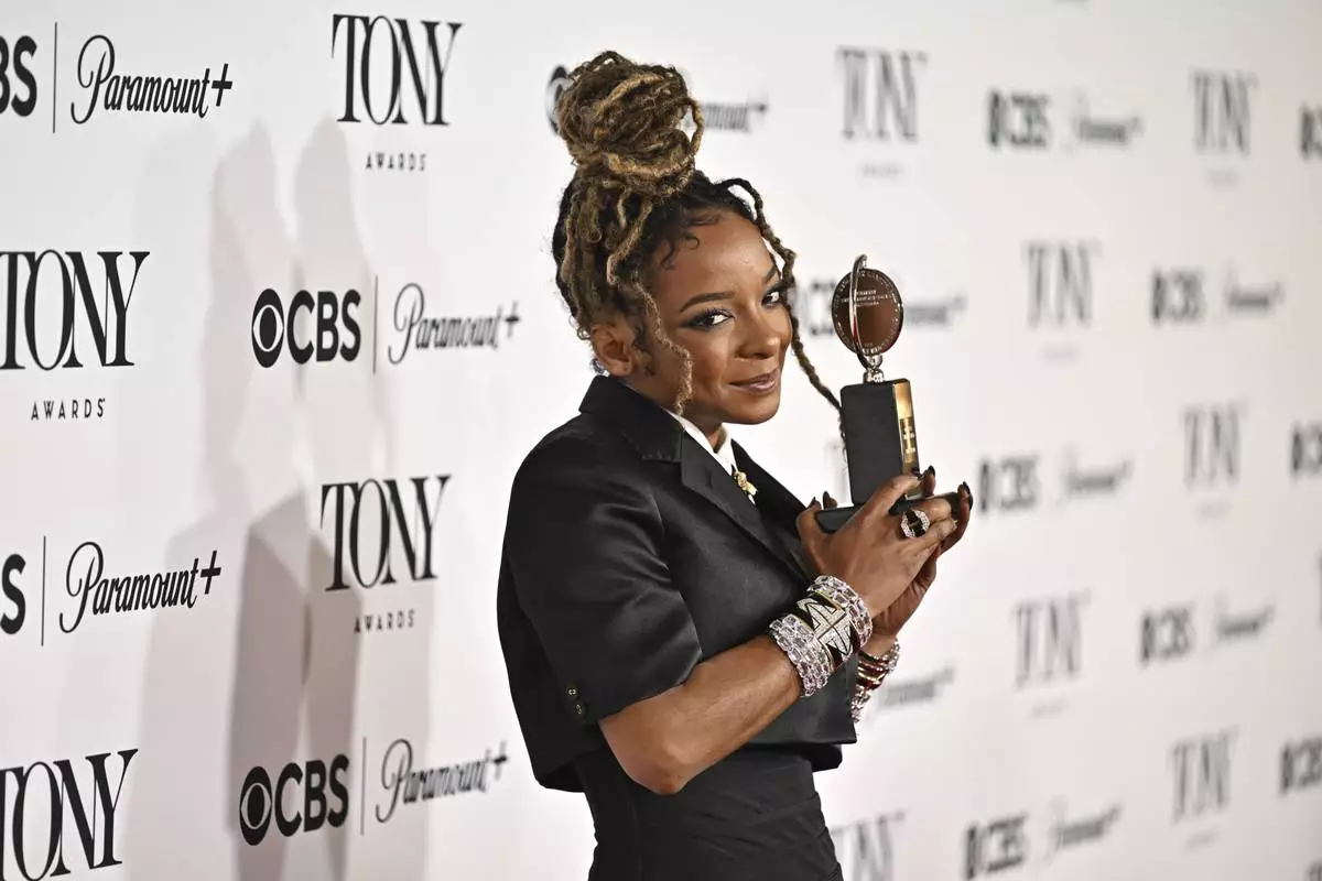 Kara Young poses in the press room with the award for best performance by an actress in a featured role in a play for "Purpose" during the 78th Tony Awards on Sunday, June 8, 2025, at Radio City Music Hall in New York. (Photo by Evan Agostini/Invision/AP)
