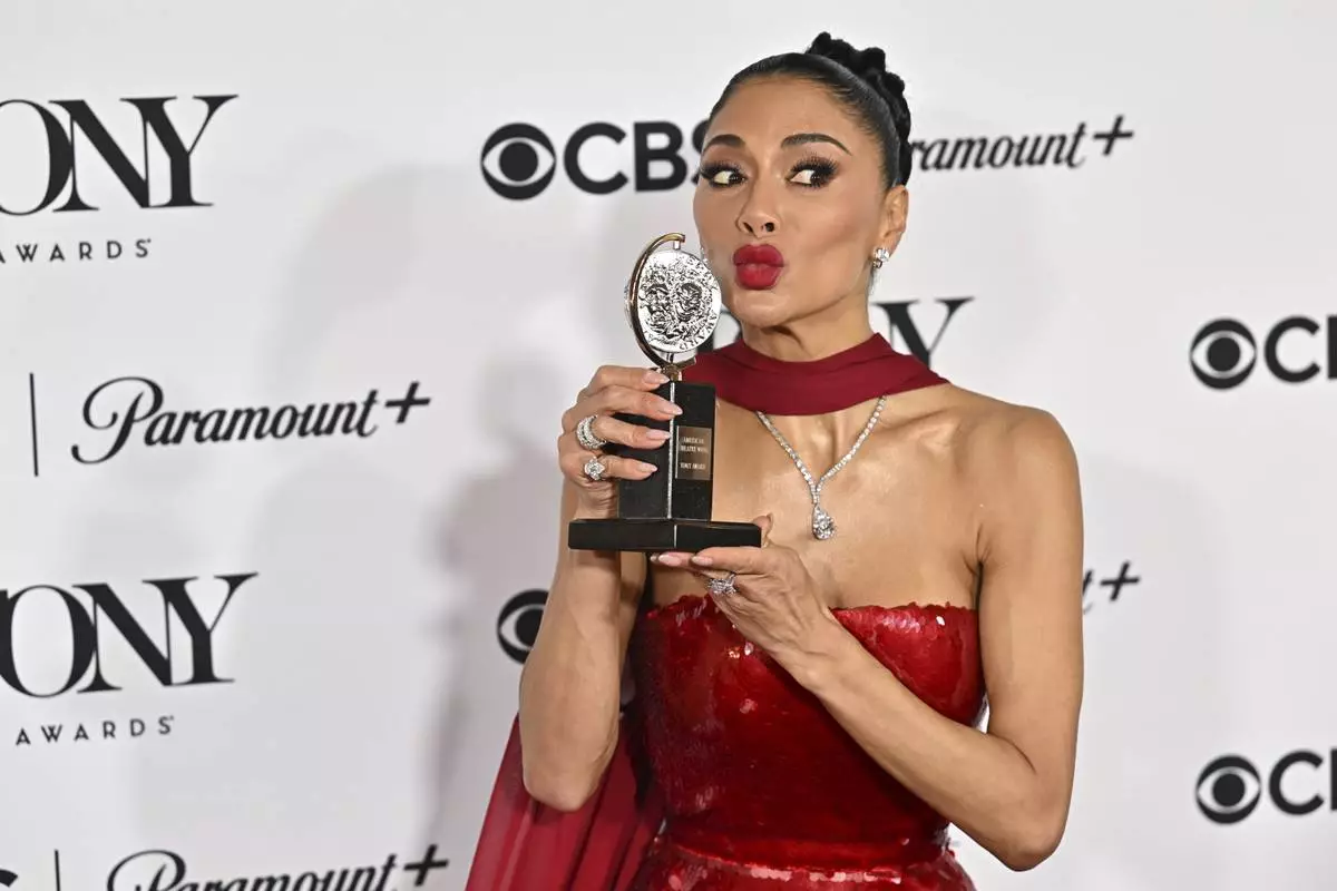 Nicole Scherzinger poses in the press room with the award for best performance by an actress in a leading role in a musical for "Sunset Blvd." during the 78th Tony Awards on Sunday, June 8, 2025, at Radio City Music Hall in New York. (Photo by Evan Agostini/Invision/AP)