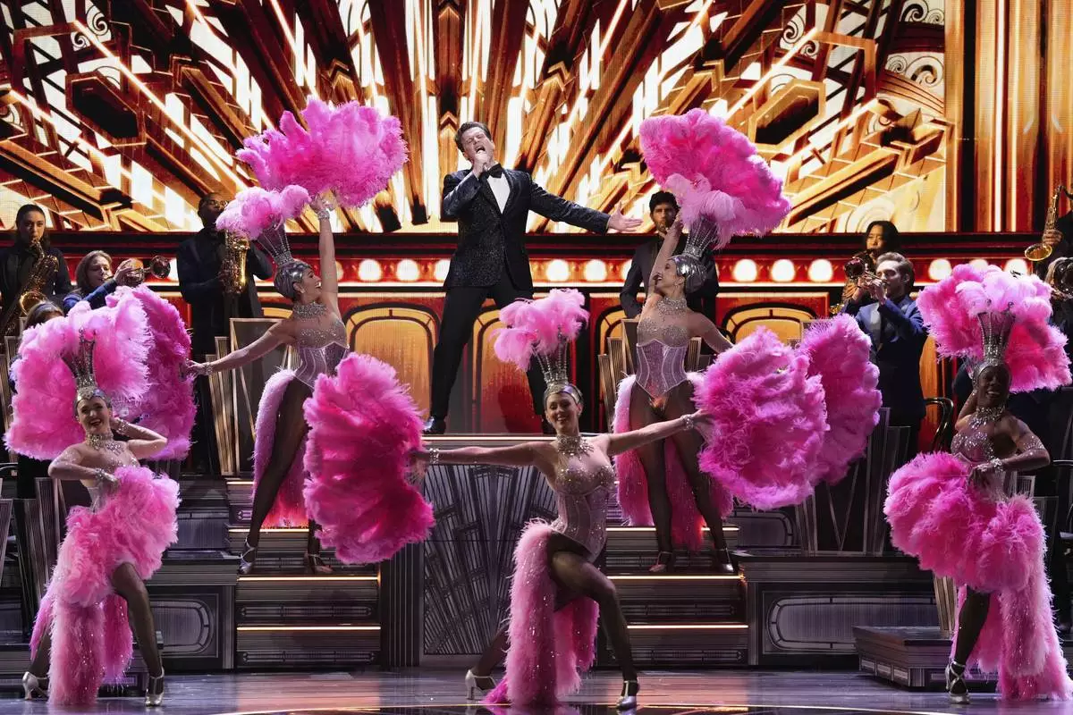 Jonathan Groff, center, performs a medley from "Just in Time" during the 78th Tony Awards on Sunday, June 8, 2025, at Radio City Music Hall in New York. (Photo by Charles Sykes/Invision/AP)