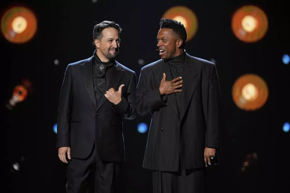 Lin-Manuel Miranda, left, and Leslie Odom Jr. perform a medley from "Hamilton" during the 78th Tony Awards on Sunday, June 8, 2025, at Radio City Music Hall in New York. (Photo by Charles Sykes/Invision/AP)