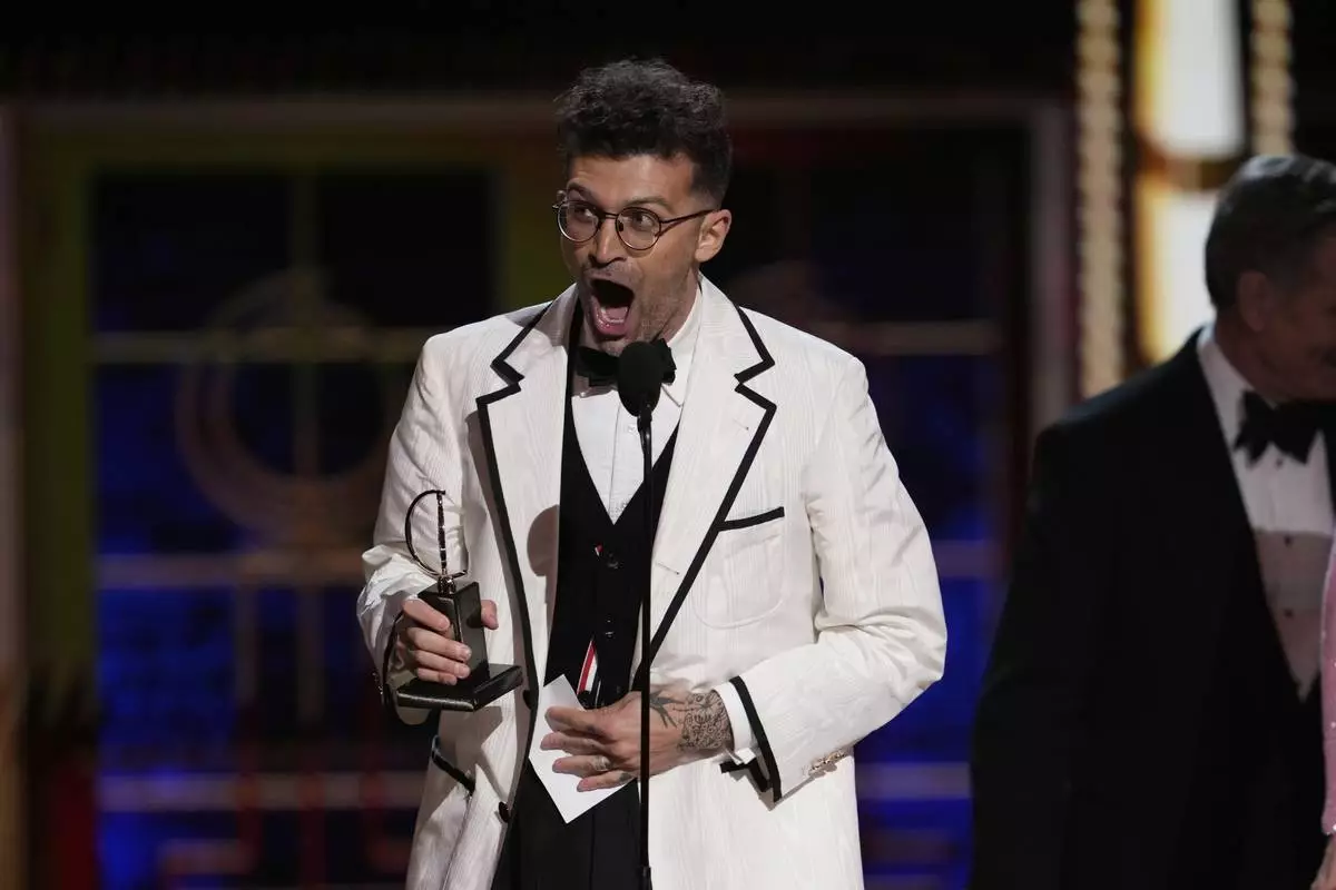 Sam Pinkleton accepts the award for best direction of a play for "Oh, Mary!" during the 78th Tony Awards on Sunday, June 8, 2025, at Radio City Music Hall in New York. (Photo by Charles Sykes/Invision/AP)