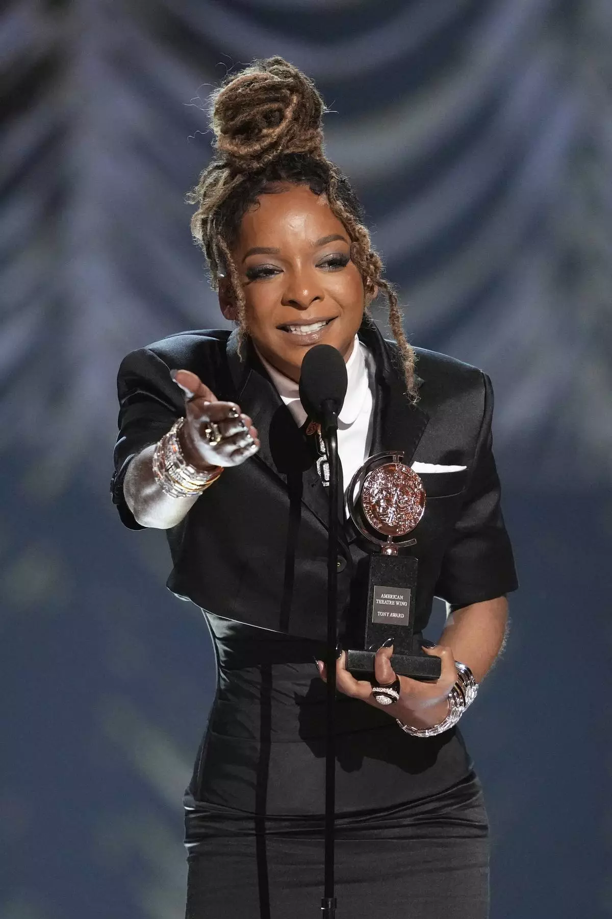 Natalie Venetia Belcon accepts the award for best performance by an actress in a featured role in a musical for "Buena Vista Social Club" during the 78th Tony Awards on Sunday, June 8, 2025, at Radio City Music Hall in New York. (Photo by Charles Sykes/Invision/AP)