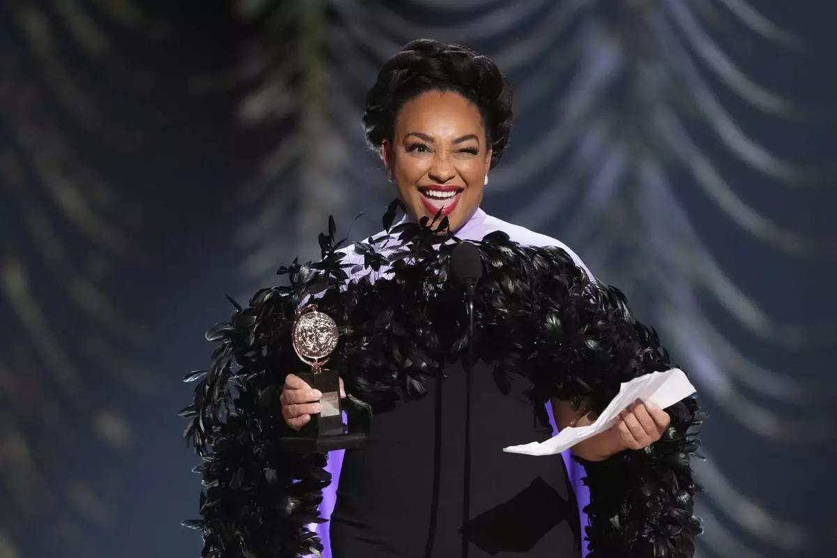 Kara Young accepts the award for best performance by an actress in a featured role in a play for "Purpose" during the 78th Tony Awards on Sunday, June 8, 2025, at Radio City Music Hall in New York. (Photo by Charles Sykes/Invision/AP)