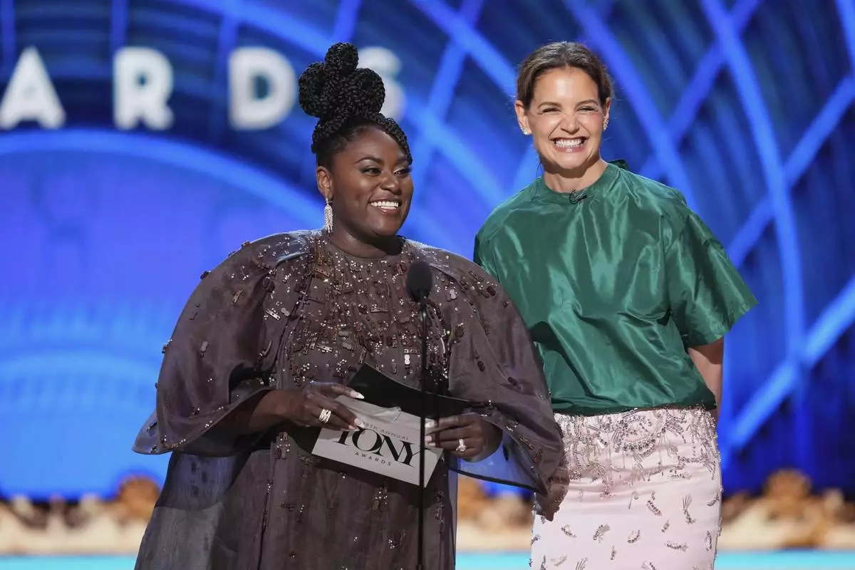 Danielle Brooks, left, and Katie Holmes present the award for best performance by an actor in a featured role in a play during the 78th Tony Awards on Sunday, June 8, 2025, at Radio City Music Hall in New York. (Photo by Charles Sykes/Invision/AP)