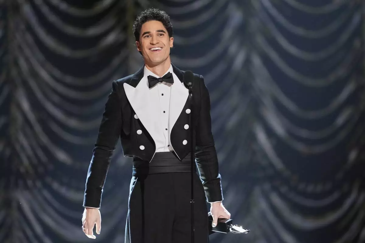 Darren Criss accepts the award for best performance by an actor in a leading role in a musical for "Maybe Happy Ending" during the 78th Tony Awards on Sunday, June 8, 2025, at Radio City Music Hall in New York. (Photo by Charles Sykes/Invision/AP)