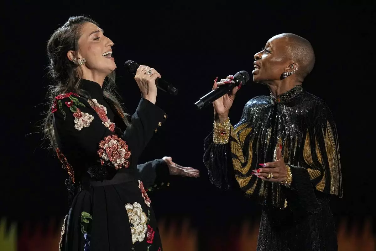 Sarah Bareilles, left, and Host Cynthia Erivo perform "Tomorrow" during the In Memoriam segment during the 78th Tony Awards on Sunday, June 8, 2025, at Radio City Music Hall in New York. (Photo by Charles Sykes/Invision/AP)
