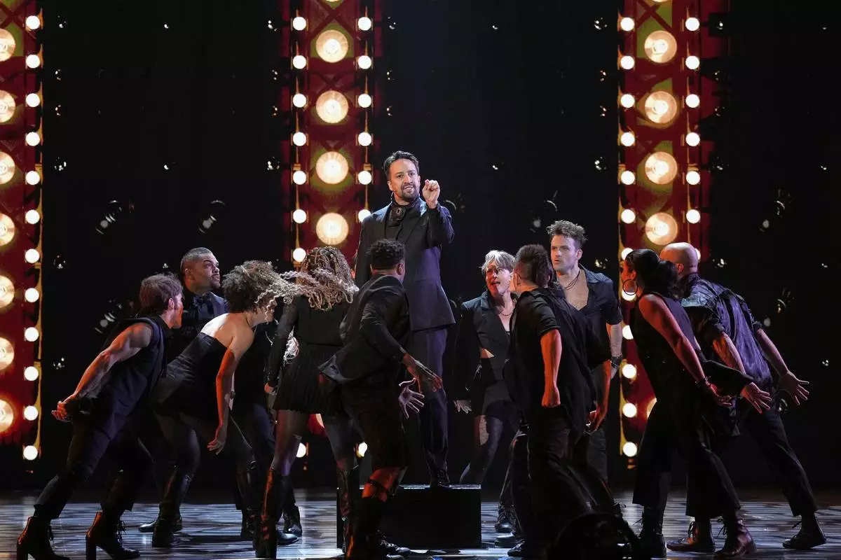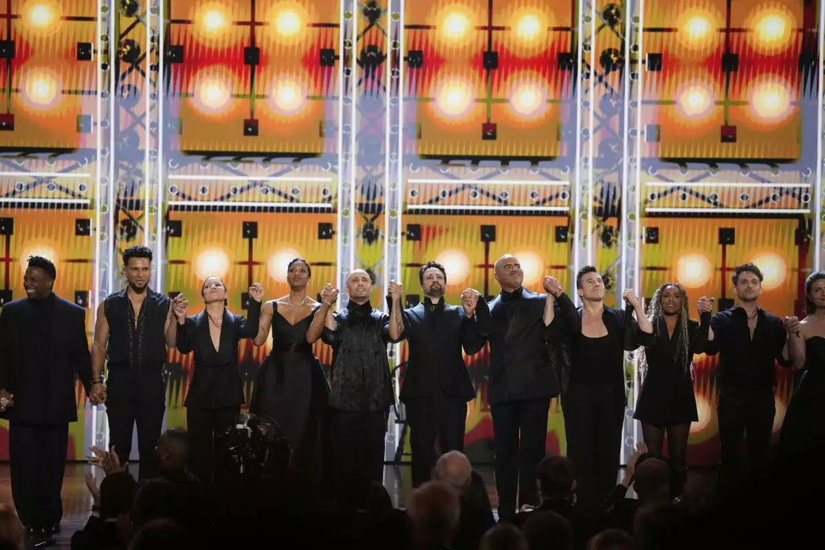 Lin-Manuel Miranda, center, performs a medley from "Hamilton" during the 78th Tony Awards on Sunday, June 8, 2025, at Radio City Music Hall in New York. (Photo by Charles Sykes/Invision/AP)
