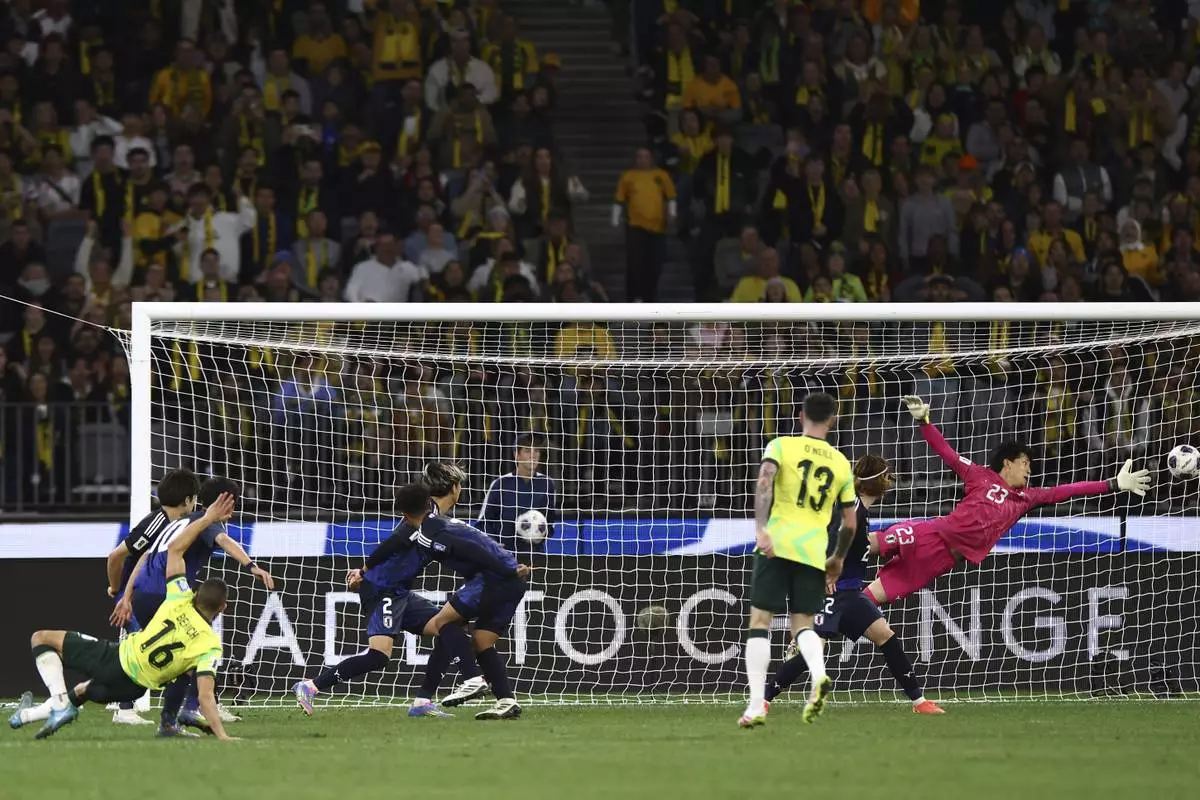 Australia's Aziz Behich, left, scores against Japan's goalkeeper Kosei Tani, right, during their World Cup 2026 group C qualifying soccer match in Perth, Thursday, June 5, 2025. (AP Photo/Trevor Collens)