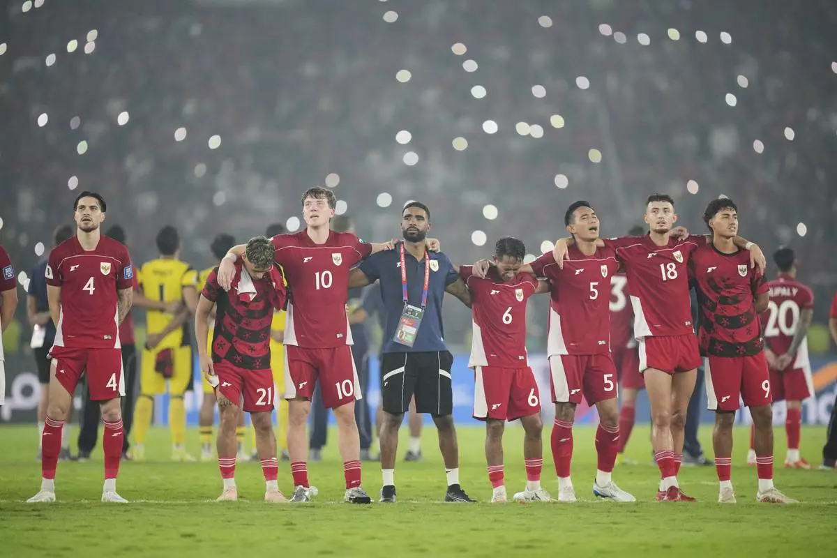 Indonesia's players and team officials celebrate their victory over China during the World Cup 2026 group C Asia qualifying soccer match between Indonesia and China at Gelora Bung Karno Main Stadium in Jakarta, Indonesia, Thursday, June 5, 2025. (AP Photo/Tatan Syuflana)
