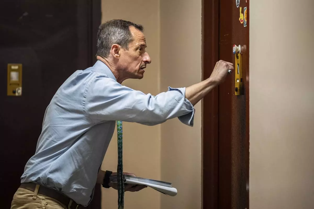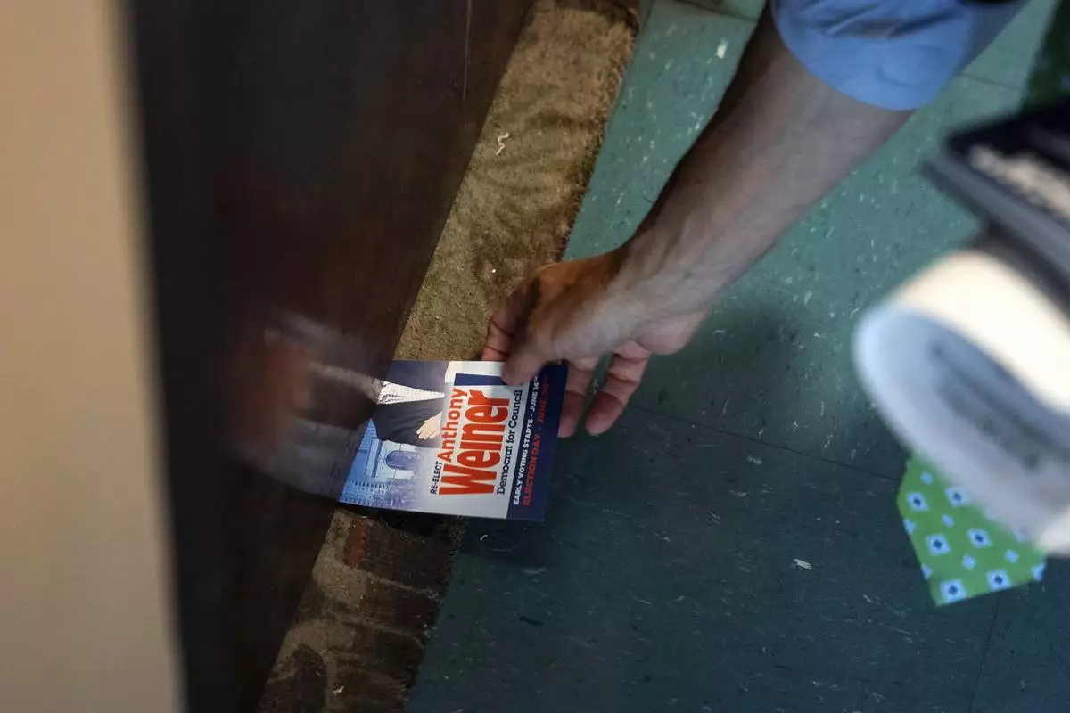 Anthony Weiner slides a campaign flyer under a resident's door while campaigning for a seat on the New York City Council, Thursday, May 29, 2025 in New York. (AP Photo/Angelina Katsanis)