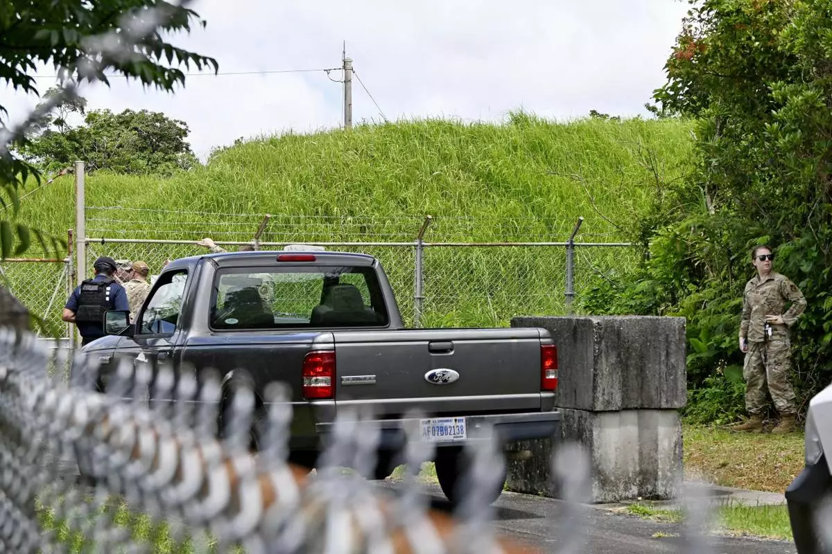 U.S. military persons gather near the site of an explosion at a storage site for unexploded ordnances at a U.S. military base in the town of Yomitanson, Okinawa prefecture, southern Japan Monday, June 9, 2025. (Kyodo News via AP)