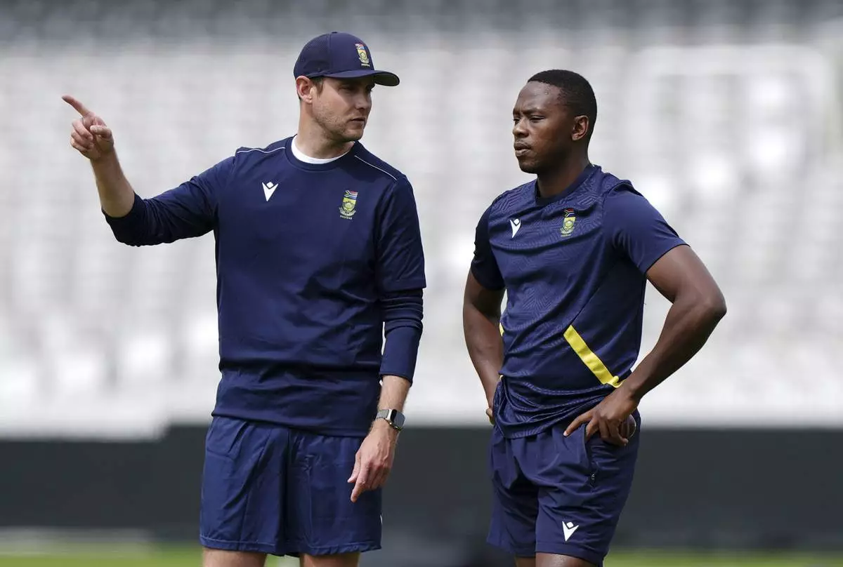 South Africa coach Stuart Broad speaks to Kagiso Rabada, right, during a nets session at Lord's, London, Monday June 9, 2025. (Ben Whitley/PA via AP)