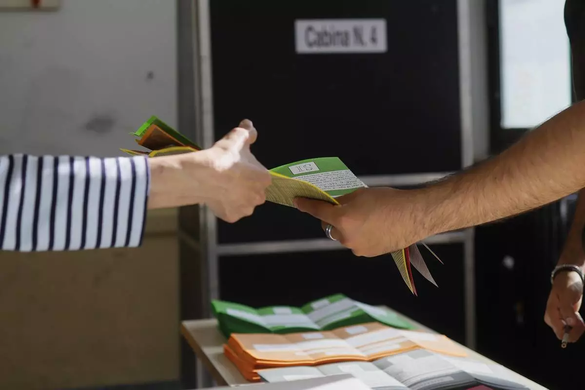 Ballot papers are handed over to a citizen, left, to vote on referendums on citizenship and job protections, at a polling station in Rome, Sunday, June 8, 2025. (Cecilia Fabiano/LaPresse via AP)