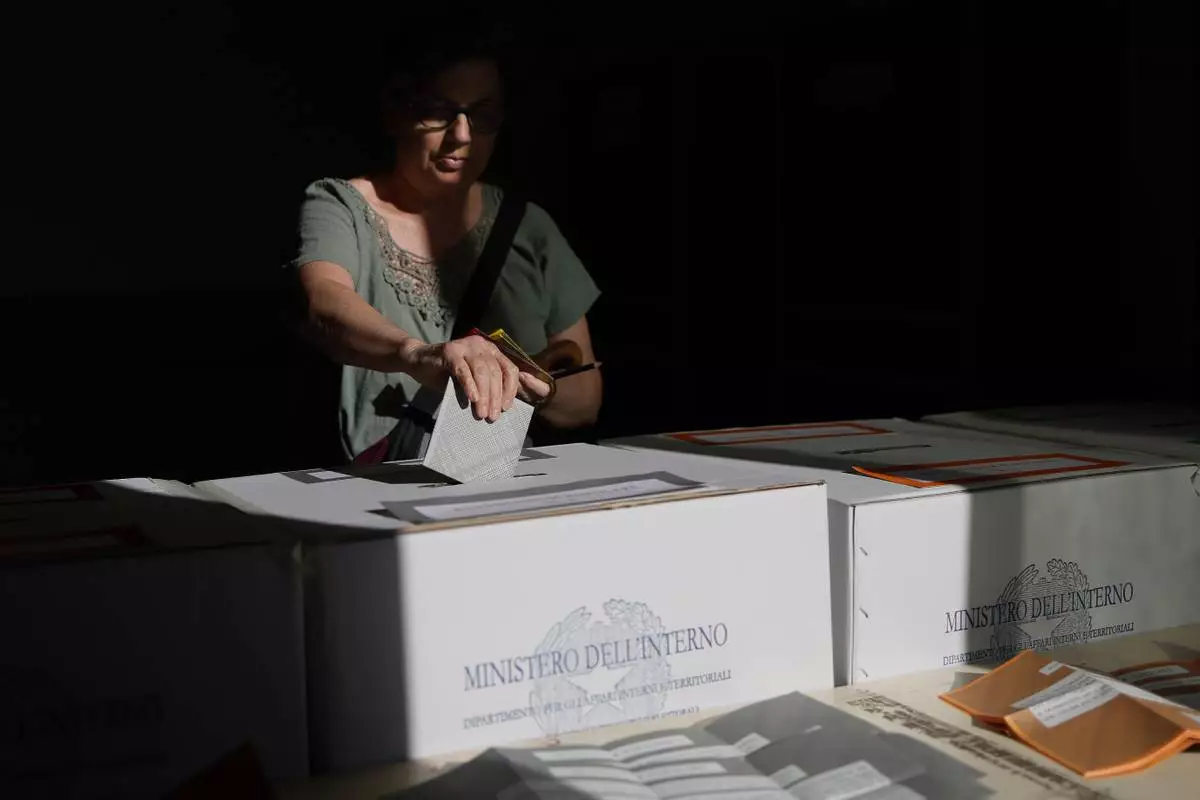 A woman casts her ballot in a box for referendums on citizenship and job protections, at a polling station in Milan, Italy, Sunday, June 8, 2025. (Claudio Furlan/LaPresse via AP)