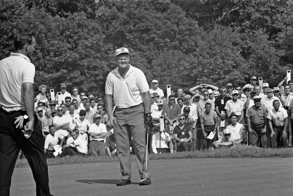 FILE - Jack Nicklaus reacts on the first green during the playoff for the National Open Golf Tournament in Oakmont, Penn., June 17, 1962, against Arnold Palmer. (AP Photo/Preston Stroup, file)