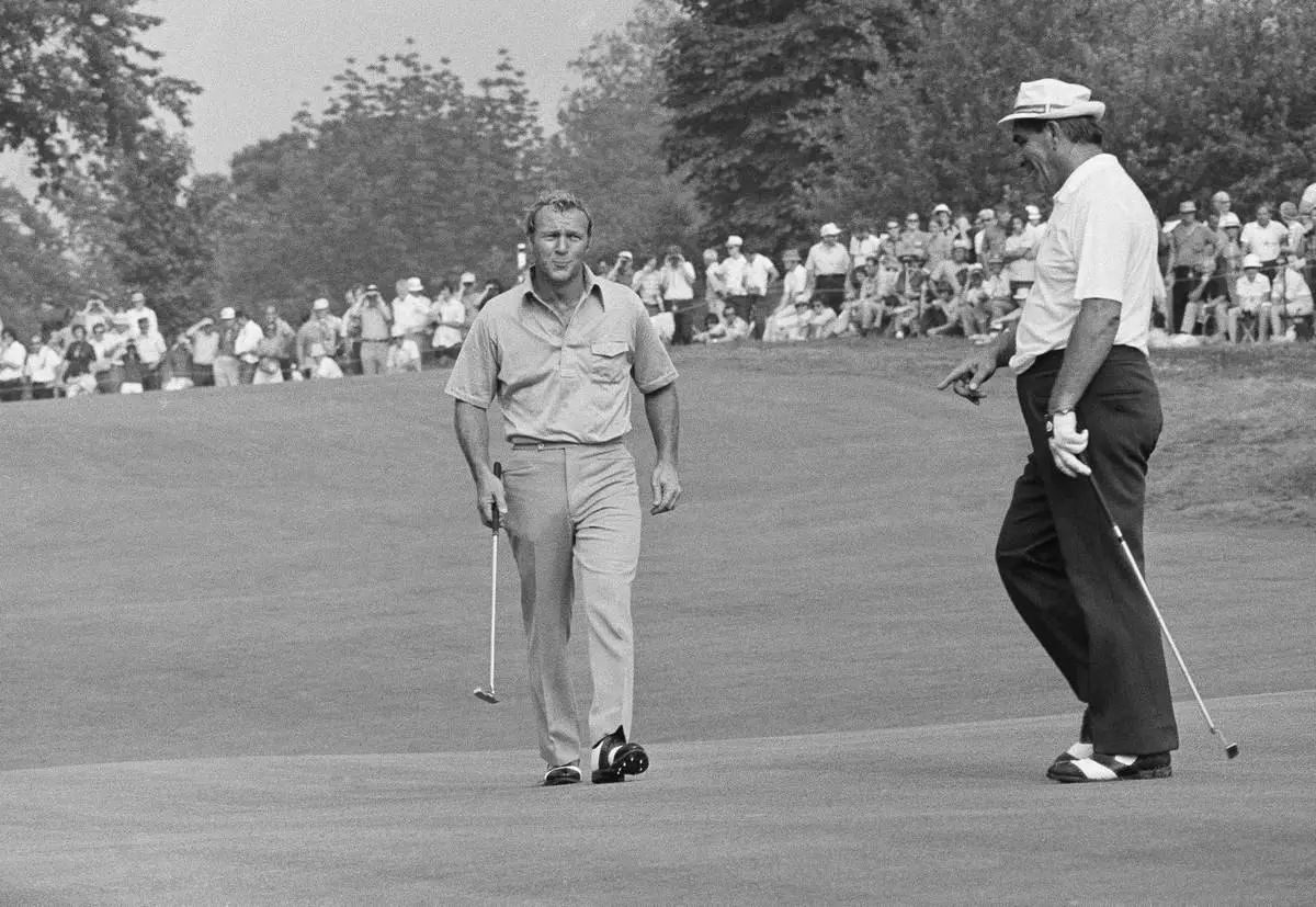 FILE - Arnold Palmer, left, swings his club as he and Julius Boros walk on to green at Oakmont Country Club at Oakmont, Penn., where they were in a four-way tie for the lead in the end of third round of the U.S. Open Golf Championship, June 16, 1973. Palmer, Boros, Jerry Hear and John Schlee all had 3 under 210. (AP Photo/File)