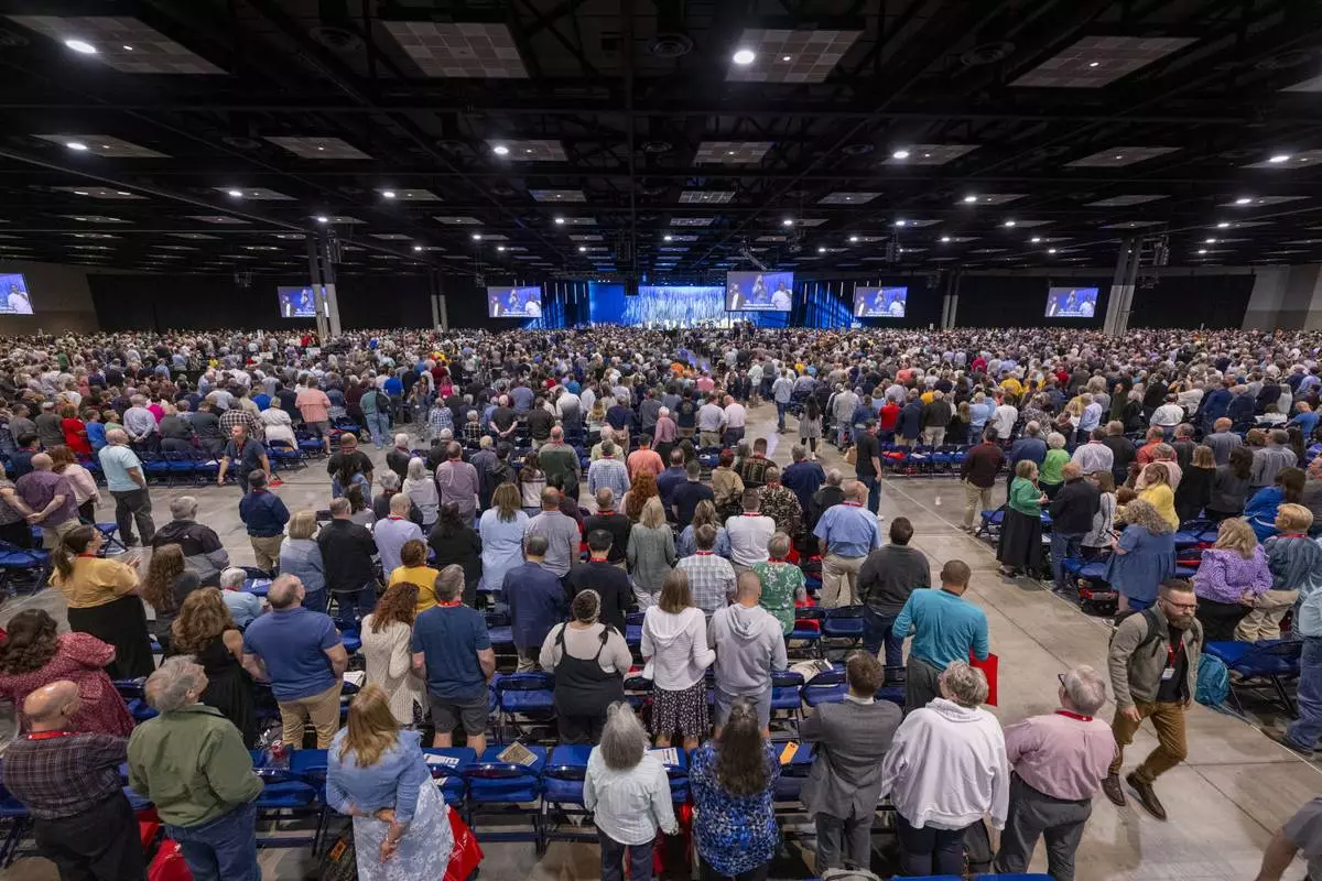 FILE - Messengers stand for worship during a Southern Baptist Convention annual meeting Tuesday, June 11, 2024, in Indianapolis. (AP Photo/Doug McSchooler, File)