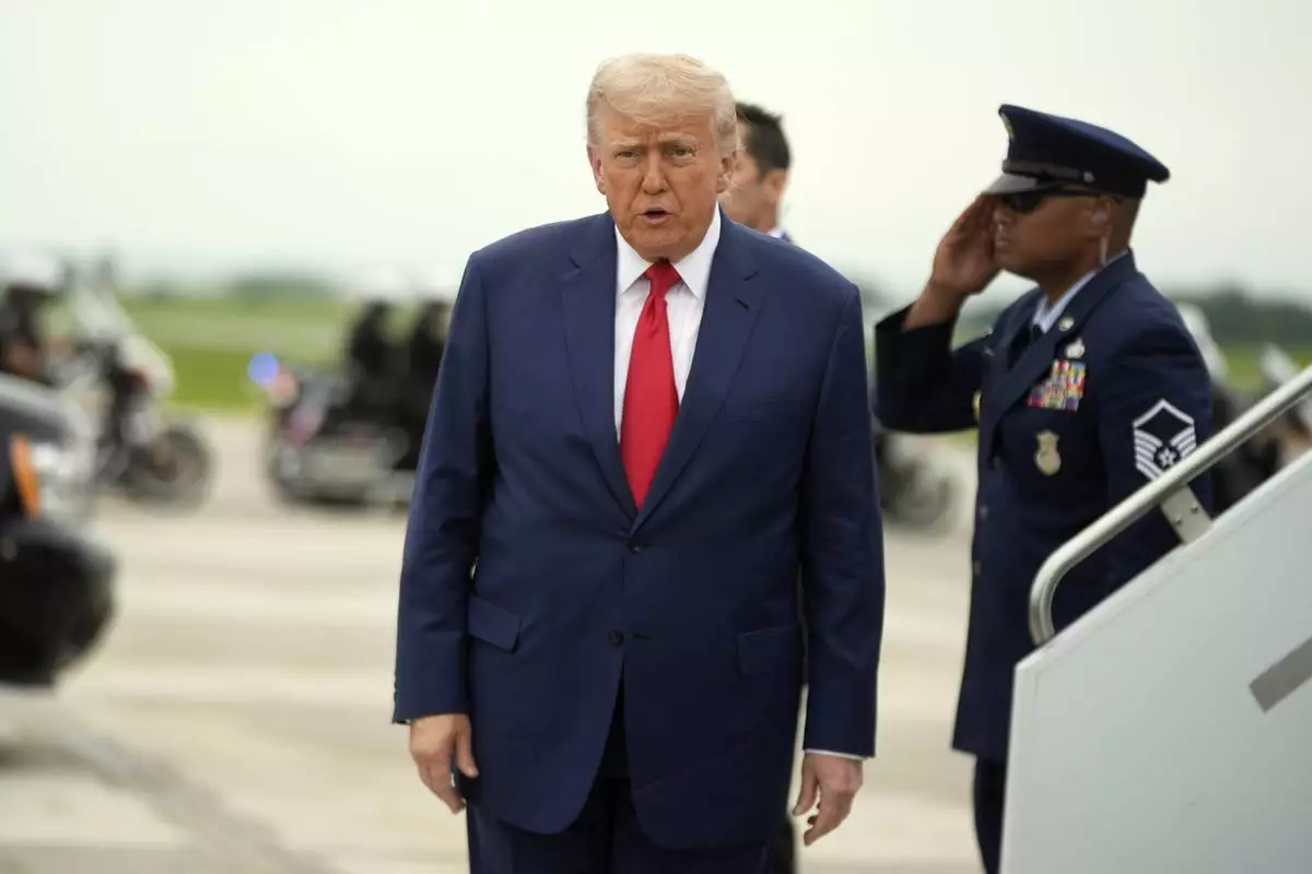 President Donald Trump arrives on Air Force One at Hagerstown Regional Airport, in Hagerstown, Md., on his was to Camp David, Md., Sunday, June 8, 2025. (AP Photo/Manuel Balce Ceneta)