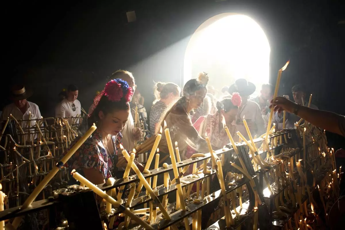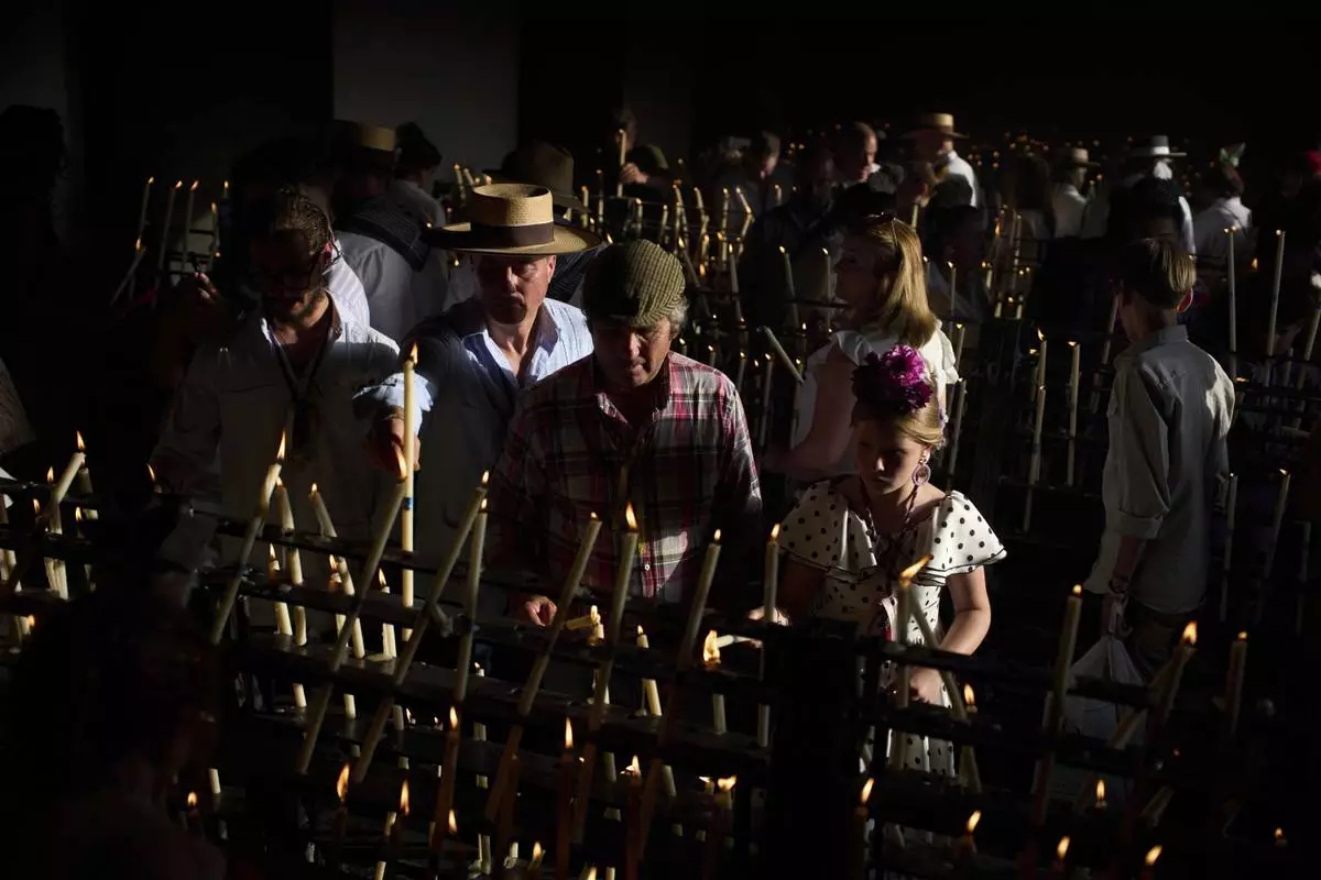 Pilgrims light candles at the shrine of El Rocio near Aznalcázar, Spain, on Saturday June 7, 2025, during the annual pilgrimage in which hundreds of thousands of devotees of the Virgin del Rocio converge in and around the shrine. (AP Photo/Emilio Morenatti)