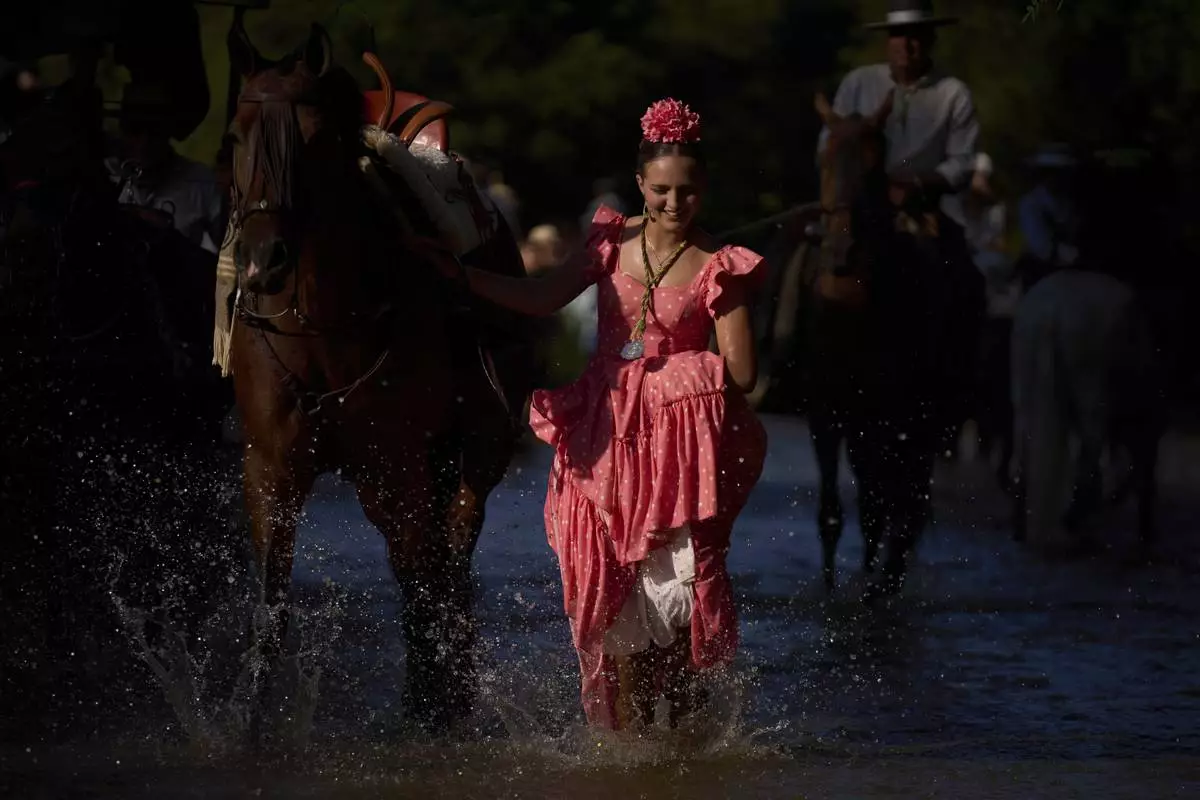 Pilgrims cross the Quema river near Aznalcázar, Spain, a crucial point in the annual Catholic pilgrimage to the shrine of the Virgin of El Rocio that draws hundreds of thousands of faithful, on June 5, 2025. (AP Photo/Emilio Morenatti)