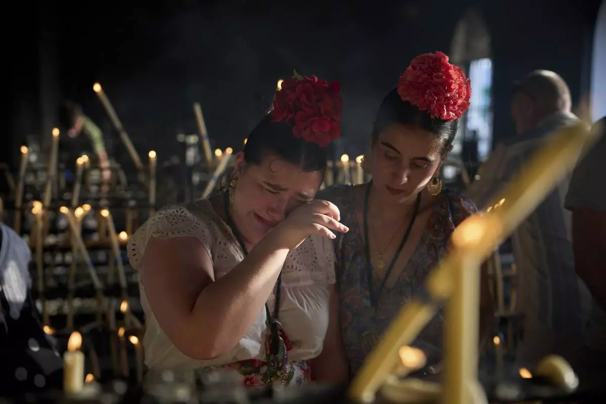 Pilgrims react as they light candles at the shrine of El Rocio near Aznalcázar, Spain, on Saturday June 7, 2025, during the annual pilgrimage in which hundreds of thousands of devotees of the Virgin del Rocio converge in and around the shrine. (AP Photo/Emilio Morenatti)