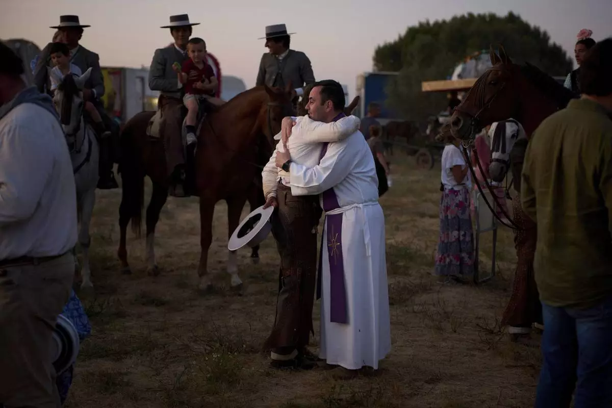 A pilgrim hugs a priest during mass on their way to the shrine of El Rocio near Aznalcázar, Spain, during the annual Catholic pilgrimage to the shrine of the Virgin of El Rocio, that draws hundreds of thousands of faithful, on June 5, 2025. (AP Photo/Emilio Morenatti)