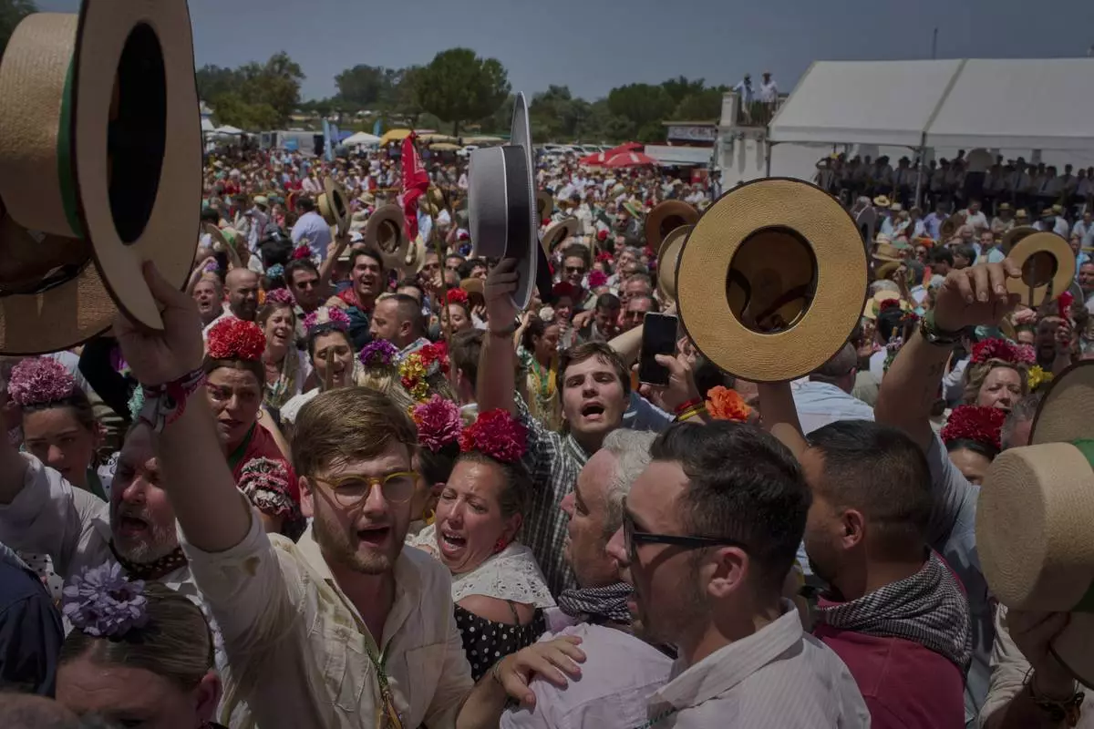 Pilgrims from the Triana brotherhood react as they arrive at the shrine of El Rocio near Aznalcazar, Spain, on June 7, 2025, during the annual pilgrimage in which hundreds of thousands of devotees of the Virgin del Rocio converge in and around the shrine. (AP Photo/Emilio Morenatti)