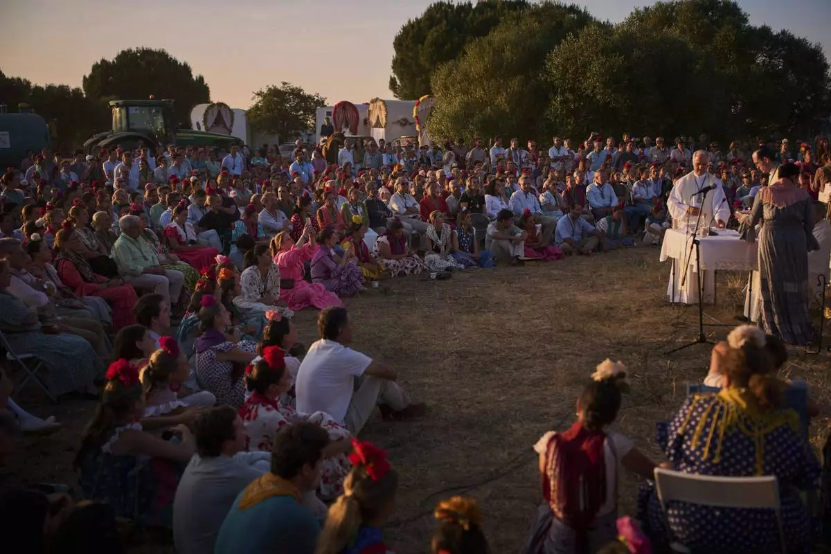 The festive flamenco music stopped, the ubiquitous beer bottles and wine glasses were put down, and the Catholic faithful prayed an evening rosary by pine trees in the wilderness a few miles from the hamlet of El Rocío.