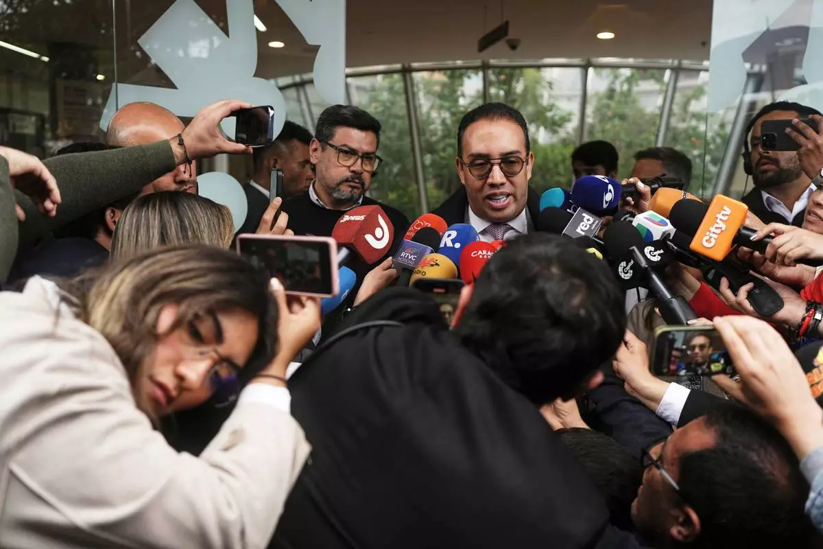 Lawyer Victor Mosquera, representative of Senator Miguel Uribe Turbay, talks outside the clinic where the Colombian Senator is being treated after he was shot at a political rally in Bogota, Colombia, Monday, June 9, 2025. (AP Photo/Ivan Valencia)