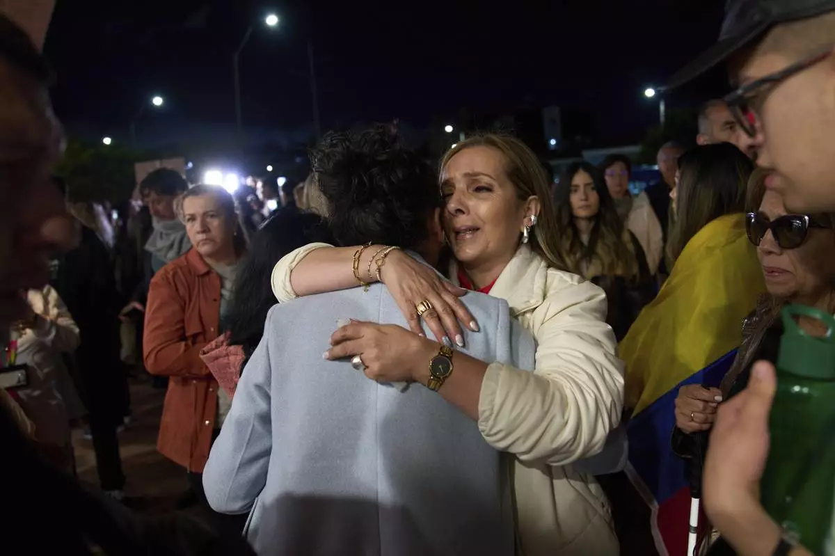 People hug each other outside the clinic where Colombian Sen. Miguel Uribe Turbay is being treated after he was shot at a political rally, in Bogota, Colombia, Sunday, June 8, 2025. (AP Photo/Ramon Espinosa)