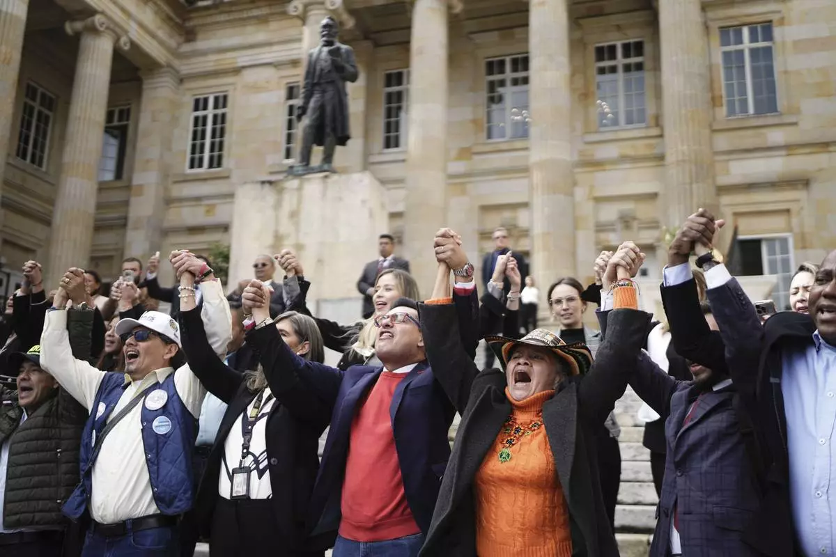 Lawmakers gather outside Congress to show support for Senator Miguel Uribe Turbay while he is in critical condition after being shot at a political rally in Bogota, Colombia, Monday, June 9, 2025. (AP Photo/Ivan Valencia)