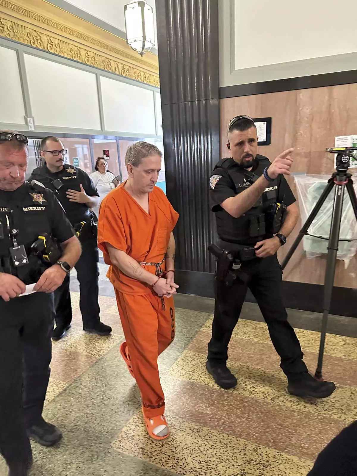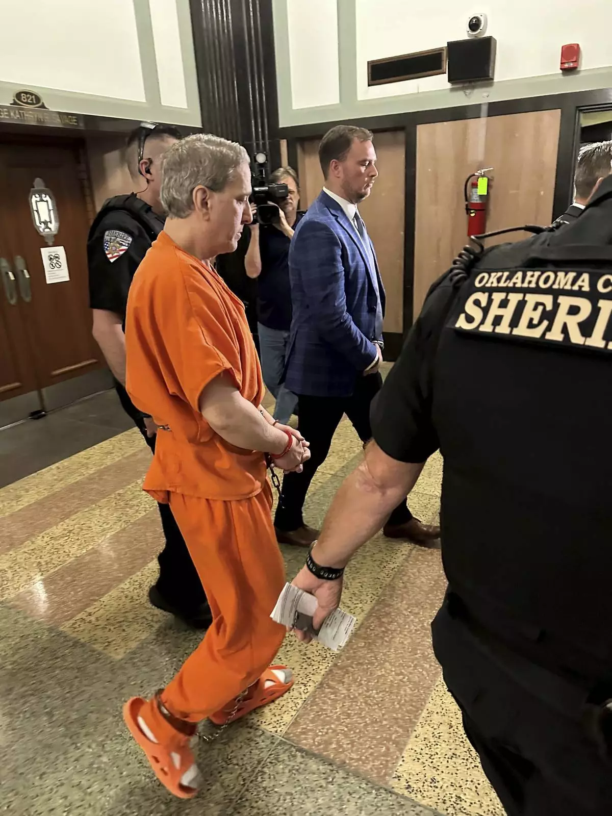 Oklahoma County Sheriff's deputies lead longtime death row inmate Richard Glossip to a courtroom on Monday, June 9, 2025, at the Oklahoma County Courthouse in Oklahoma City. (AP Photo/Sean Murphy)